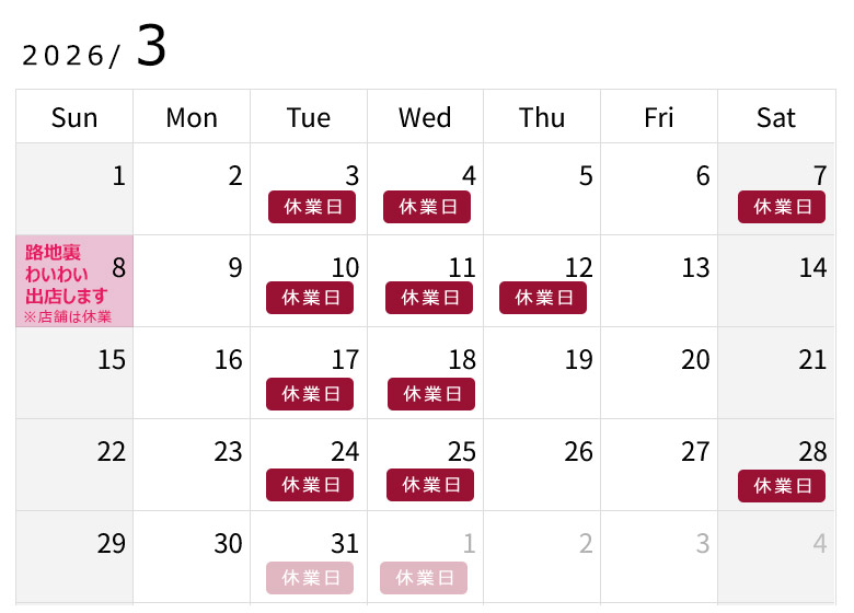 - 1/11(日):《路地裏わいわい》出店のため店舗休業